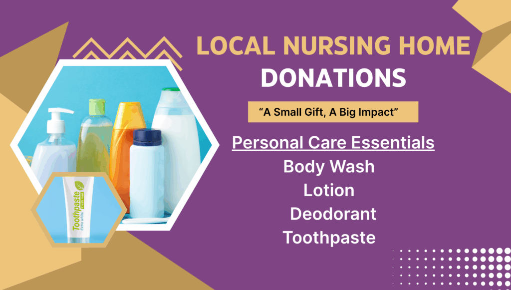 Donate body wash, lotion, deodorant, and toothpaste for a local nursing home. Bring items on Sundays.